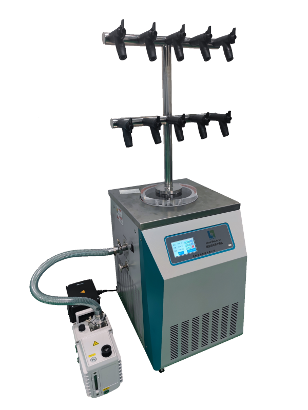 Microecological freeze-drying technology, also known as sublimation drying, is a method of freezing a water-containing sample in advance and then sublimating its moisture in a vacuum state. Freeze-dried items, the original biological, chemical and physical properties are basically unchanged, easy to long-term preservation, after adding water can be restored to the state before freeze-drying, and can maintain its original biochemical properties. The sample is pre-frozen in a special bottle and connected to the freeze-drying cover by a rubber valve. The freeze-dried bottle can be replaced at any time through the on-off valve during the freeze-drying process, and different kinds of samples can be freeze-dried at the same time, and 10 special bottles of different capacities can be hung at the same time, and the drying efficiency is high. |